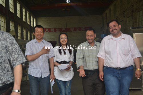 圖為明經(jīng)理陪同客戶參觀我們的廠房!90噸大豆預(yù)處理浸出生產(chǎn)線順利成交!
